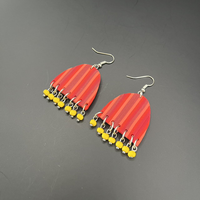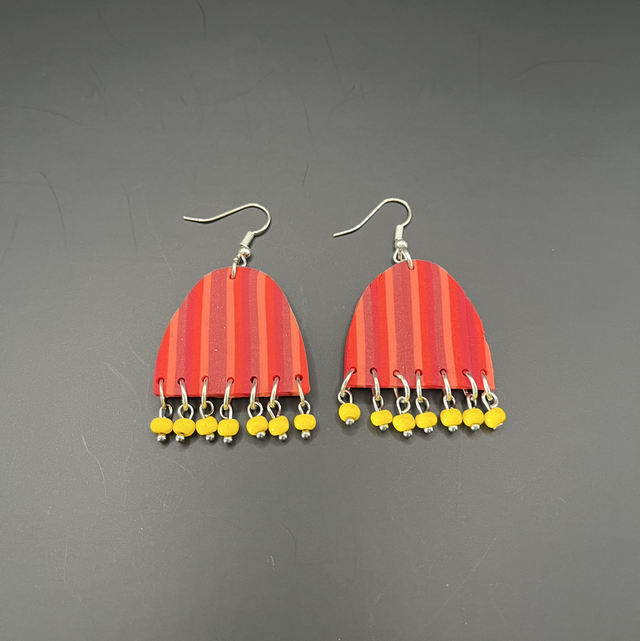 Boucles d'oreilles en pâte polymère Fimo, ornées de lignes verticales dans les tons de rouge et de courtes franges jaunes.
