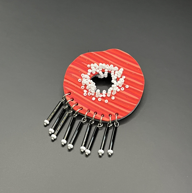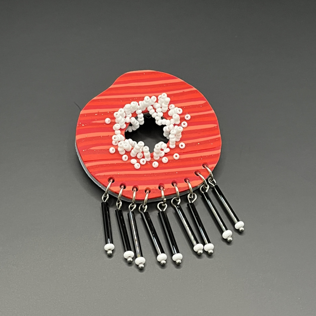 Broche à franges en pâte polymère et perles. Techniques utilisées : modelage et couture.