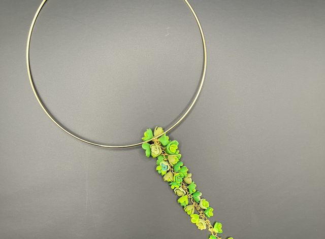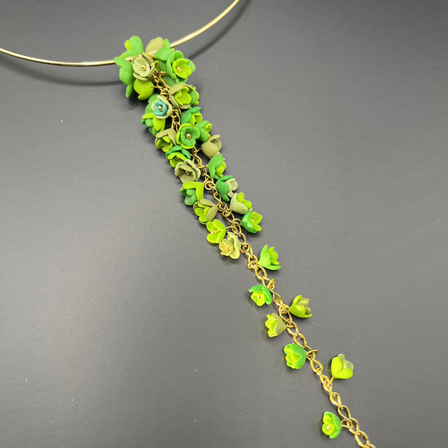 Un collier léger et délicat, créé à partir de petites fleurs en pâte polymère Fimo, en forme de grappes de raisin.