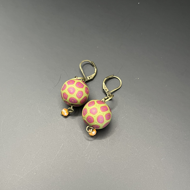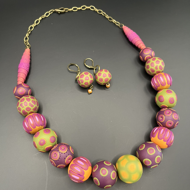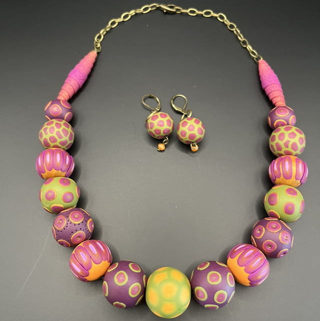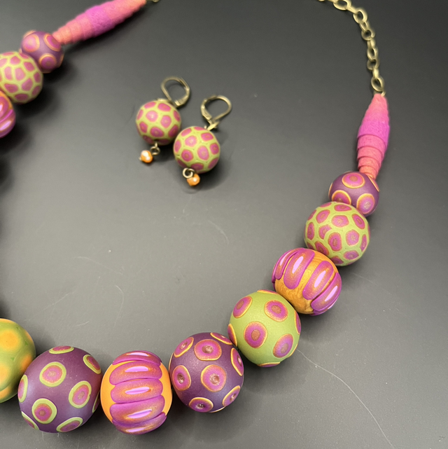 Collier statement créé entièrement à la main en pâte polymère, composé de perles modelées et décorées individuellement selon la technique du millefiori, chacune possédant son propre rythme visuel et un jeu subtil de textures.