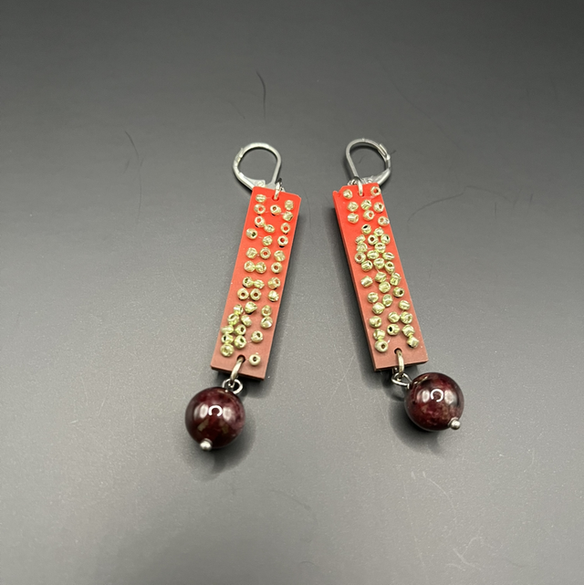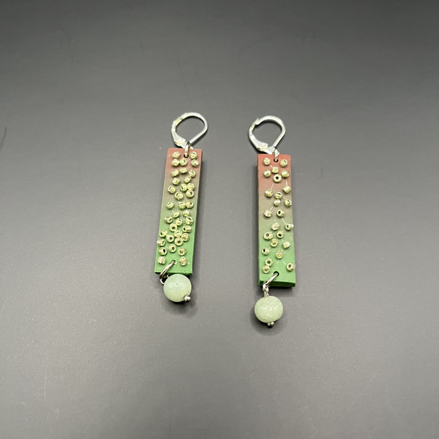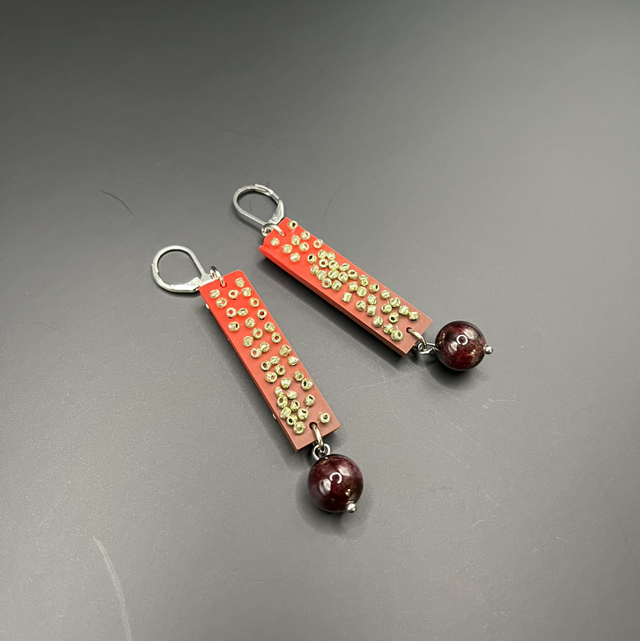 Boucles d'oreilles artisanales en pâte polymère à dégradé rouge-vert, petites pierres cousues et une perle de grenat.