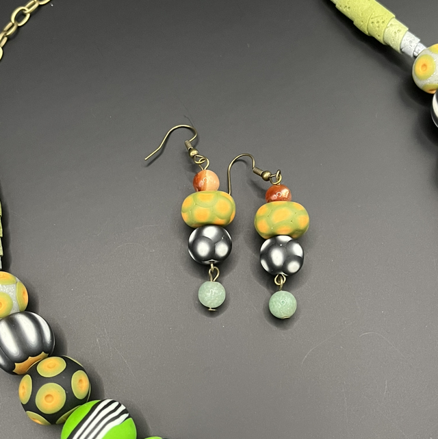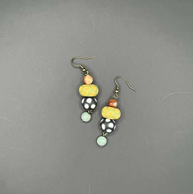 Boucles d’oreilles créées à la main en pâte polymère, composées de perles modelées et décorées individuellement selon la technique du millefiori, agrémentées d’une pierre semi-précieuse. Chaque élément possède son propre rythme visuel et un jeu subtil de textures.