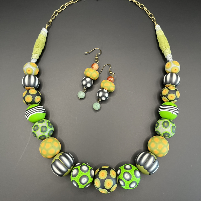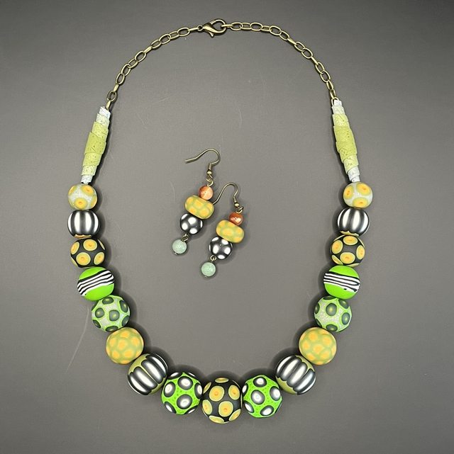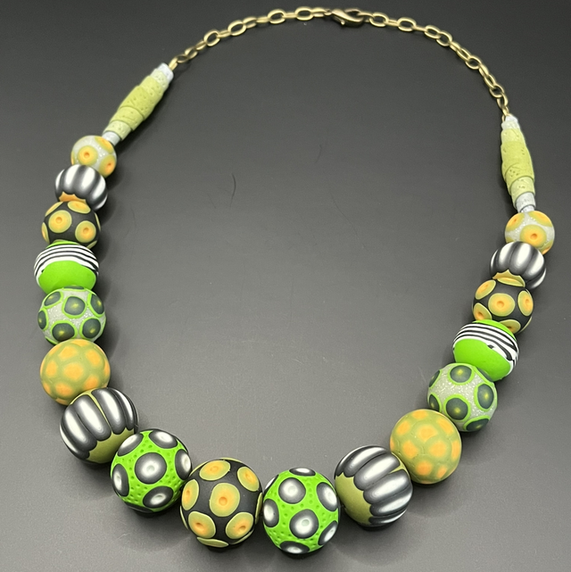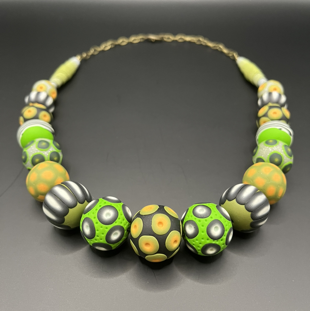 Collier statement créé entièrement à la main en pâte polymère, composé de perles modelées et décorées individuellement selon la technique du millefiori, chacune possédant son propre rythme visuel et un jeu subtil de textures. Les nuances vibrantes de vert, de jaune et de gris métallisé s’harmonisent dans une composition dynamique, ponctuée de motifs graphiques et organiques évoquant des cellules, des graines et des formes naturelles stylisées.